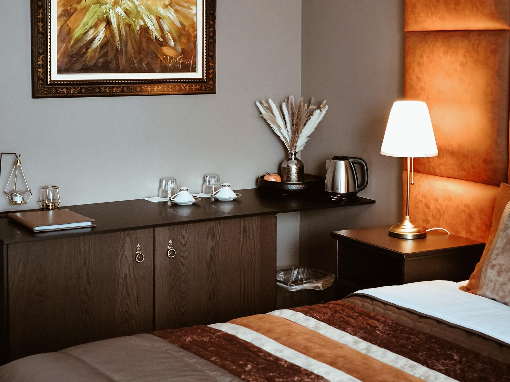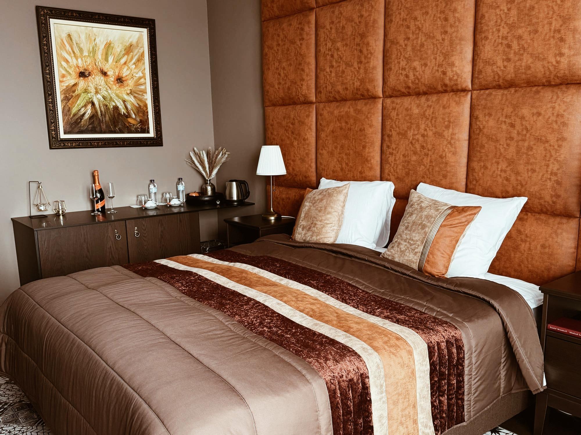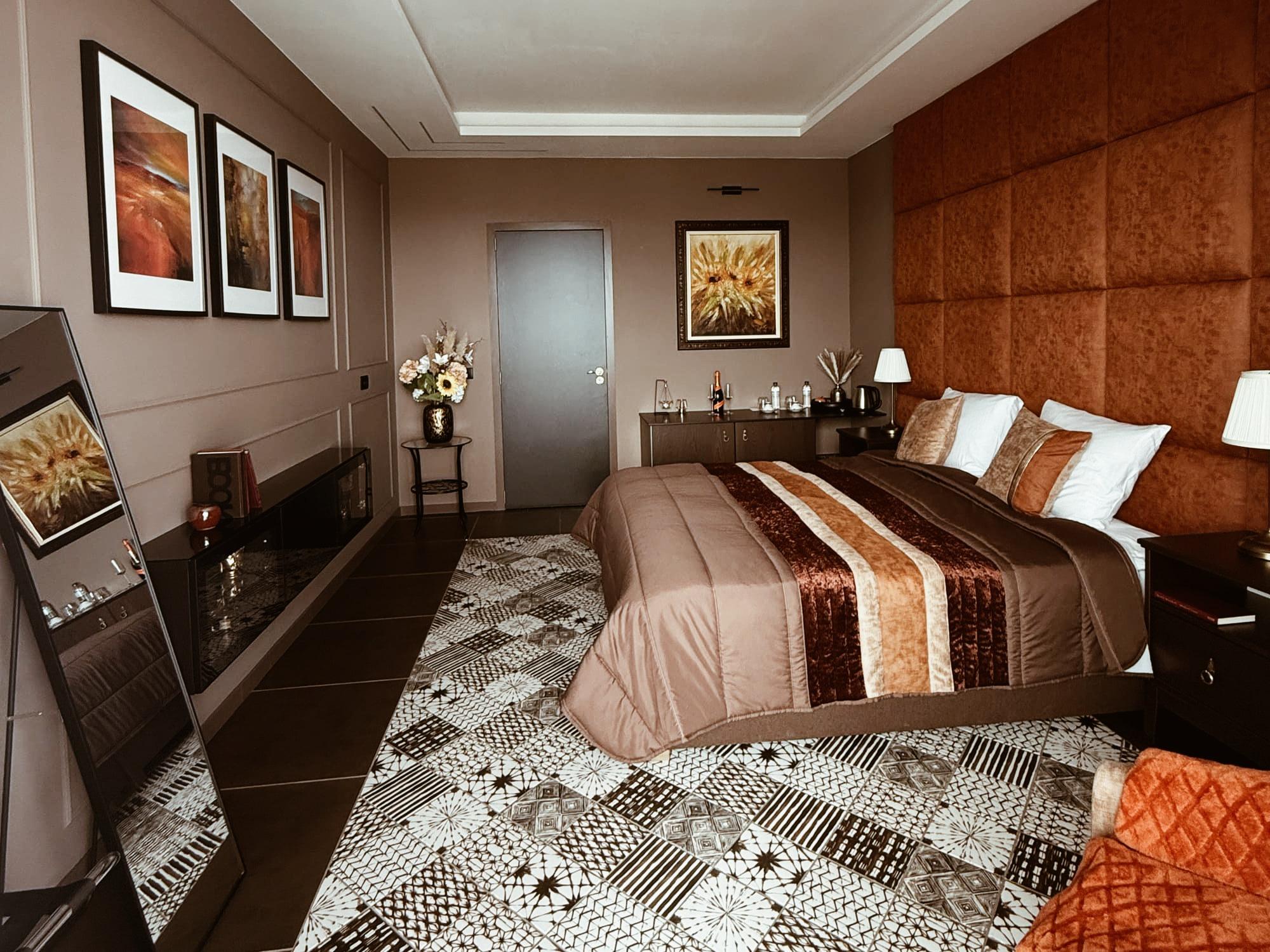 The Room Fire features a plush king-sized bed with a contemporary black velvet headboard, complemented by deep, warm tones that evoke intensity and comfort. Soft lighting and elegant design details create an atmosphere that feels both powerful and soothing — a perfect balance of strength and serenity.